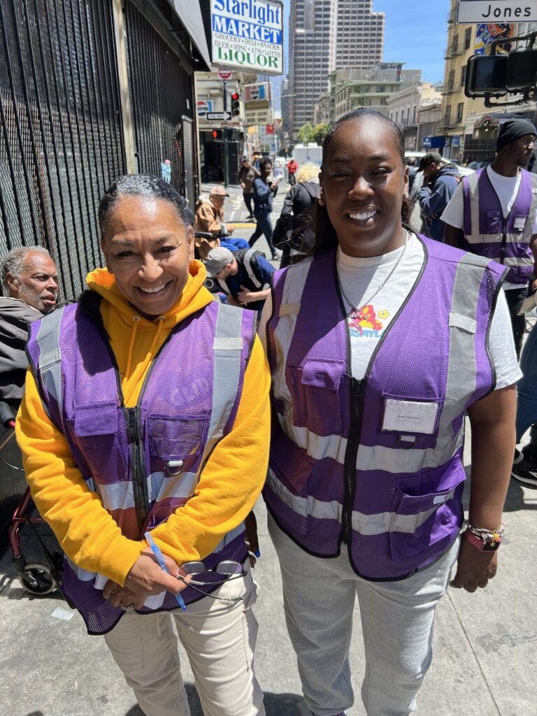 For Jamika, being an Ambassador means delivering outcomes that create a safe environment for everyone. She recently found an apartment for an unhoused woman named Jessica and her husband. Between smiles and some tears, Jamika described the joy of seeing them finally find a place they could call home. It took several conversations with Jessica over a number of weeks to finalize the process, but Jamika never gave up. She grew up in San Francisco and thinks about her own friends and family in every person she encounters on the street. “When people see the Ambassadors, they feel comfortable. They’re happy to see us coming and they know we’re here to help.”