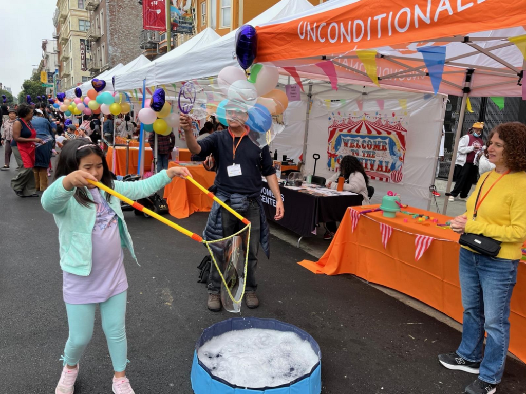 What started off as overcast and grey, later turned into a radiant blue sky, with Ellis Street in front of GLIDE transformed into a festival of belonging. Families, friends, and community members wandered among the tents, enjoying live performances, food, games, and the unmistakable sense of togetherness that defines the Tenderloin spirit. Orange and red heart banners lined the street—a visual echo of GLIDE’s mission to embody unconditional love and radical inclusivity.