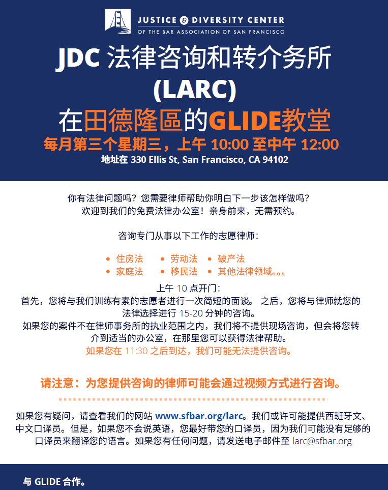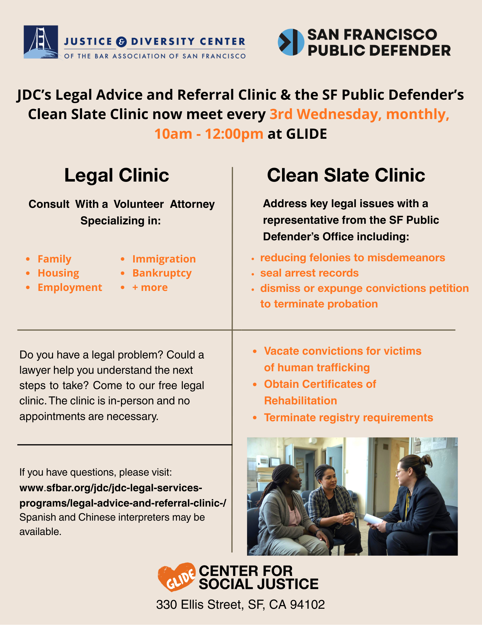 GLIDE is delighted to announce its partnership with the Justice & Diversity Center (JDC) of the Bar Association of San Francisco. to help our clients access legal services. Legal help from the JDC will be available for our clients on the 3rd Wednesday of every month from 10:00 am – 12:00 pm, starting February 19th of 2025.