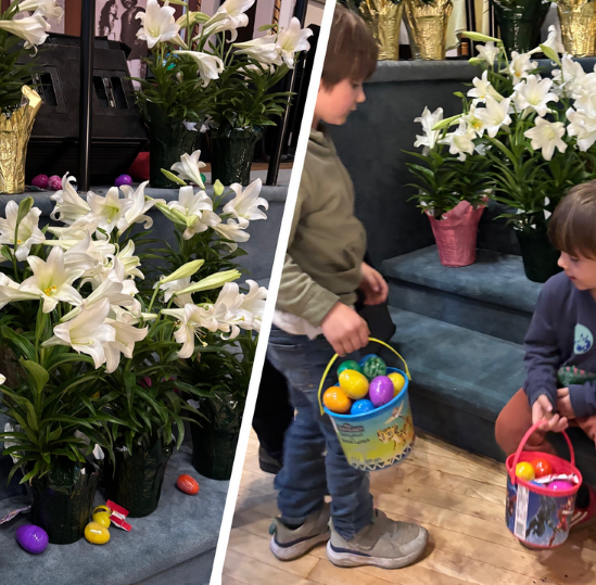 In the sanctuary, the children dashed about to find all the chocolate, candy and eggs our volunteer bunnies had cunningly hidden: 1500 eggs/treats in total (not counting the tootsie rolls). For years, our volunteers have followed this tradition of bringing joy to the families of the Tenderloin.